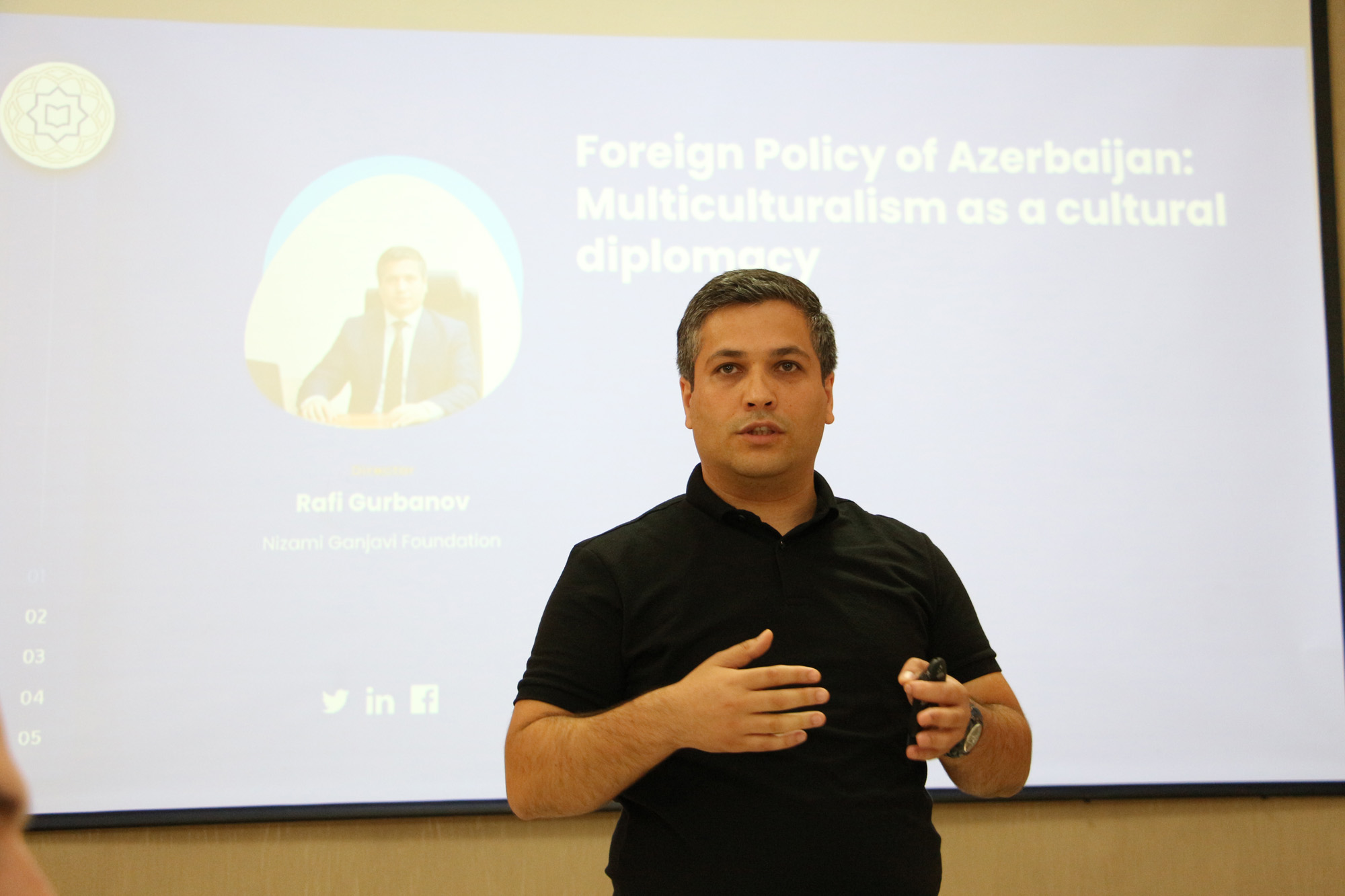 Anar Qafarov öz təqdimatında cəmiyyətdə mədəni müxtəlifliyi formalaşdıran tarixi, coğrafi, dini və mədəni amillərdən danışıb, Azərbaycanı bu baxımdan gözəl bir nümunə kimi qeyd edib. O bildirib ki, Azərbaycanda multikulturalizmlə bağlı dəyərlərin öyrənilməsi və cəmiyyətimizdə insanların sülh şəraitində yaşaması üçün həm siyasi, həm ideoloji, həm də ictimai tədbirlər təşkil olunur və multikultural dəyərlərə hörmət Azərbaycan xalqının tarixi xüsusiyyətidir. Azərbaycan xalqı tarix boyu müxtəlif mədəniyyətlərin nümayəndələrinə, onların dəyərlərinə ehtiramla yanaşıb və bu gün də yanaşır. Ölkəmizdə müxtəlif dinlərin nümayəndələrinə və onların məbədlərinə diqqət və qayğı göstərilir.