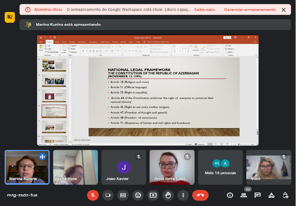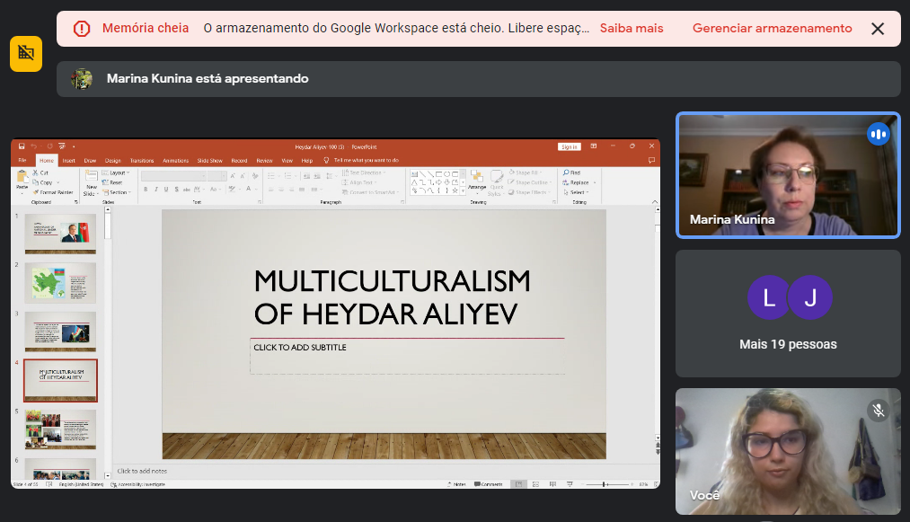 Bakı Beynəlxalq Multikulturalizm Mərkəzinin Tədris şöbəsinin müdiri dosent İrina Kunina Sovet İttifaqının süqutundan sonra Azərbaycanın dirçəlişində Ümummilli Lider Heydər Əliyevin oynadığı rol barədə məlumat verib. Mühazirə zamanı Heydər Əliyevin Qarabağ probleminin həlli ilə bağlı danışıqlar prosesində rolu, neft diplomatiyası konsepsiyası, multikulturalizm siyasəti haqqında danışılıb.
