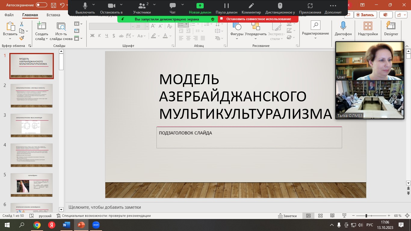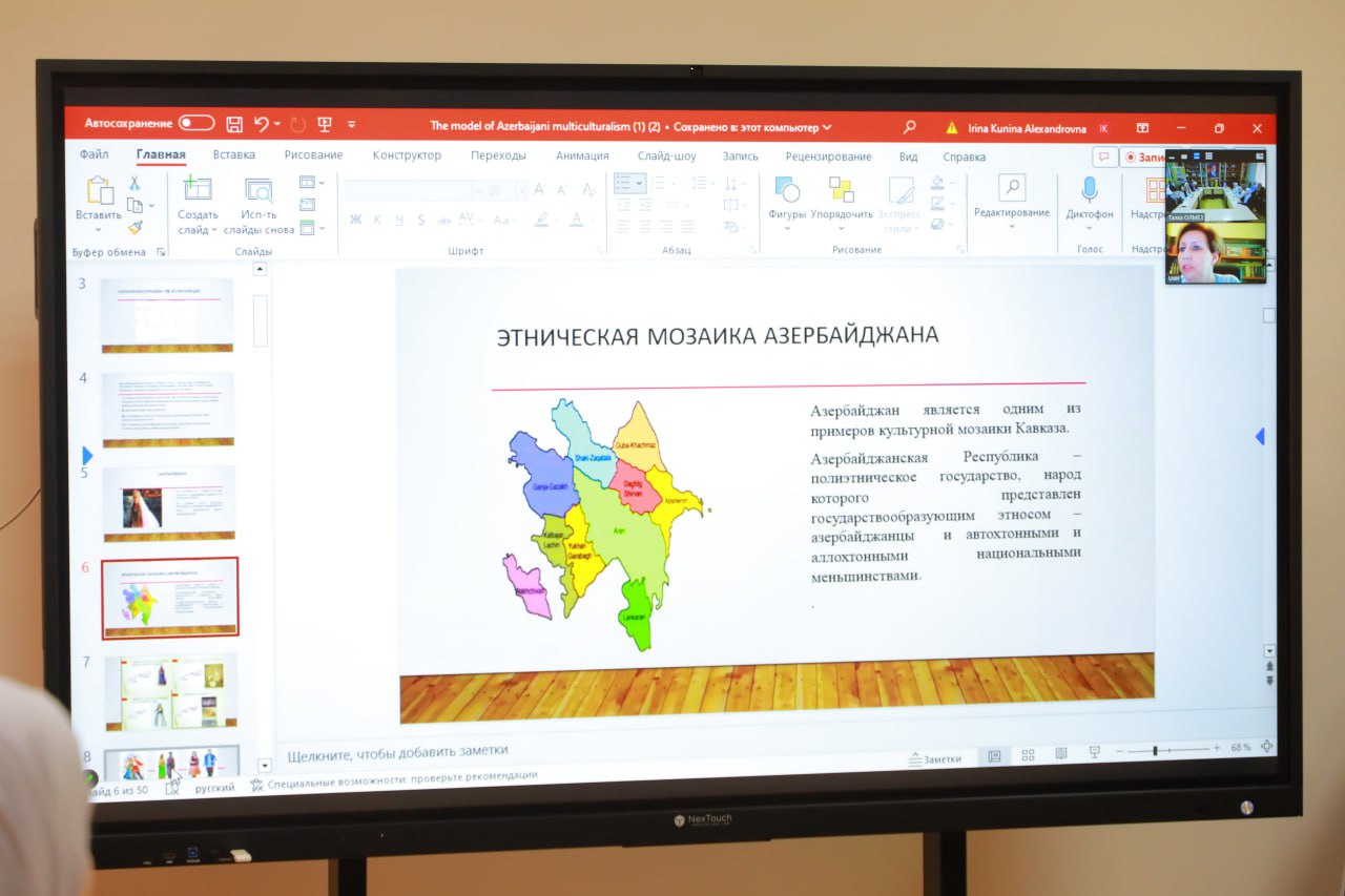 İrina Kunina Azərbaycanın tarixi, əhalisinin etnik tərkibi, mültikultralizm siyasəti haqqında məlumat verib. O, diqqətə çatdırıb ki, multikulturalizm və tolerantlıq tarixən azərbaycanlıların həyat tərzi olub, bu gün milli kimliyindən, dilindən, dinindən asılı olmayaraq Azərbaycan dövlətinin hər bir vətəndaşının gündəlik həyat tərzinə çevrilib. Mühazirəni maraqla dinləyən müəllimlər və tələbələrin mövzu ilə bağlı sualları cavablandırılıb. Onlar Azərbaycan Mədəniyyəti Mərkəzinin qarşıdan gələn tədbirlərində iştirak etməyə hazır olduqlarını bildiriblər.