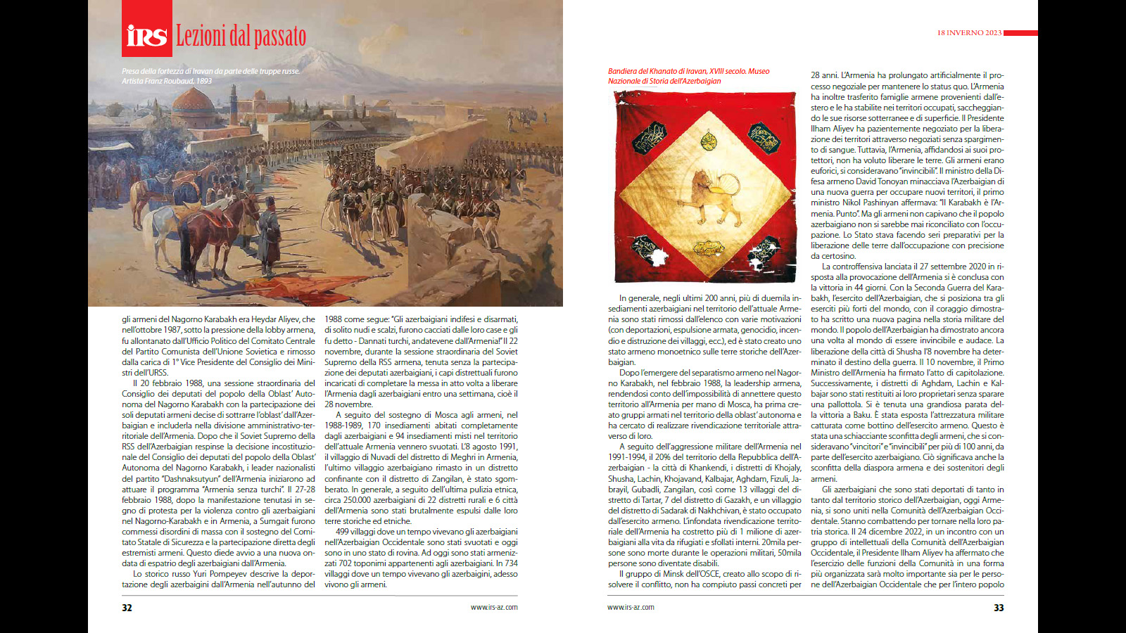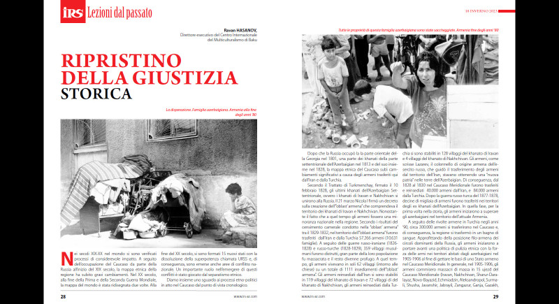 Bakı Beynəlxalq Multikulturalizm Mərkəzinin icraçı direktoru Rəvan Həsənovun "İRS" jurnalında ispan dilində məqaləsi dərc edilb. Məqalədə Ermənistanın Azərbaycanın maddi-mənəvi irsinə qarşı törətdiyi vandalizm aktı, azərbaycanlılara qarşı edilən etnik təmizləmə siyasəti barədə ətraflı məlumat verilir.