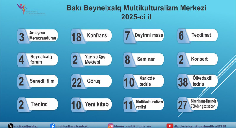 Bakı Beynəlxalq Multikulturalizm Mərkəzi (BBMM) 2025-ci ildə həm yerli, həm də beynəlxalq müstəvidə intensiv və çoxşaxəli fəaliyyət göstərib. Mərkəz il ərzində multikulturalizmin təbliği, islamofobiya və antisemitizmlə mübarizə, dağıdılmış mədəni irsin qorunması və bərpası, Qərbi azərbaycanlıların qayıdış hüququnun gündəmdə saxlanılması, eləcə də neokolonyalizmə qarşı mübarizə istiqamətlərində ardıcıl layihələr reallaşdırıb və nüfuzlu beynəlxalq platformalarda Azərbaycanın multikulturalizm modelini təqdim edib. Hesabat ilində BBMM-in təşkilatçılığı və iştirakı ilə 18 yerli və beynəlxalq konfrans keçirilib, Mərkəzin beynəlxalq fəaliyyəti isə 15 ölkəni əhatə edib. Bu konfranslar arasında Bakıda 15 mart – İslamofobiya ilə Beynəlxalq Mübarizə Gününün 3-cü ildönümünə həsr olunan “İslamofobiya: Qərəzin ifşa olunması və stiqmaların dağıdılması” beynəlxalq elmi konfransı, Vatikanda Müqəddəs Taxt-Tacın Qriqorian Pontifik Universitetində keçirilmiş “Azərbaycanda xristianlıq: tarix və müasirlik” mövzusunda Qafqaz Albaniyası irsinə həsr edilən XII beynəlxalq elmi konfrans, həmçinin Belçikanın Brüssel şəhərində “Belçika və Avropada 2025 İslam Dünyası İli” çərçivəsində keçirilən “Multikulturalizm modelləri – Münasibətlərin qurulması və sülh şəraitində birgəyaşayış modelləri haqqında düşüncələr” mövzusunda tədbir xüsusi yer tutur. BBMM eyni zamanda “Heydər Əliyev: Multikulturalizm və tolerantlıq ideologiyası” mövzusunda VIII beynəlxalq elmi konfransın da həmtəşkilatçısı olub. Mərkəzin təmsil olunduğu digər beynəlxalq toplantılara Hindistanın Şri-Şri Universitetində “Azərbaycan multikulturalizm modeli” mövzusunda mühazirə, “Dini azadlıqdan dini məsuliyyətə” adlı ikinci beynəlxalq konfrans, Avropa Komissiyası və Avropa Şurasının Brüsseldə təşkil etdiyi müsəlmanlara qarşı nifrət və irqiçilik üzrə əlaqələndirmə konfransı, “Azərbaycanşünaslığın aktual məsələləri: Yeni dövrün Azərbaycanı” XVI beynəlxalq elmi konfransı, “Davamlı sülhün əldə edilməsində dini liderlərin rolu” mövzusunda beynəlxalq konfrans və “İslamofobiya: Mövcud qlobal kontekstdə konsepsiya və təcrübə” adlı beynəlxalq toplantı daxildir. Gürcüstanın Tiflis şəhərində Qafqaz kürdlərinin II elmi-praktiki beynəlxalq konfransında, “Mədəni irs və qayıdış hüququ: Ermənistandan didərgin salınmış azərbaycanlıların mədəni irsinin bərpası – ədalətə, barışığa və sülhə aparan yol kimi” mövzusunda III beynəlxalq konfransda, Cənubi Afrikanın Keyptaun şəhərində “Fəaliyyətdə humanizm: Həssas icmalar diqqət mərkəzində” adlı G20 Dinlərarası Dialoq Forumunda, eləcə də Tunis Beynəlxalq Simpoziumunda (“Beynəlxalq sülh və təhlükəsizliyin dəstəklənməsində BMT-nin Sivilizasiyalar Alyansının rolunun aktivləşdirilməsi” mövzusunda) BBMM-in fəal iştirakı Azərbaycanın bu sahədə qlobal dialoqa verdiyi töhfənin davamlı xarakter daşıdığını göstərib.